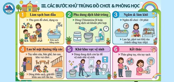 Vệ sinh đồ dùng: Thực hiện khử khuẩn đồ chơi, dụng cụ học tập và bề mặt lớp học hằng ngày bằng dung dịch sát khuẩn an toàn.