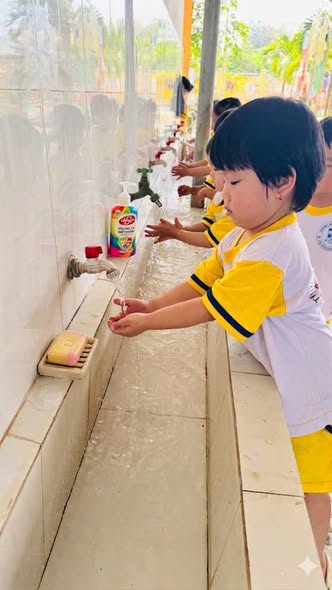 Rèn luyện thói quen: Các cô giáo hướng dẫn và giám sát bé rửa tay bằng xà phòng đúng cách vào các thời điểm quan trọng (trước khi ăn, sau khi đi vệ sinh, sau khi chơi ngoài trời).